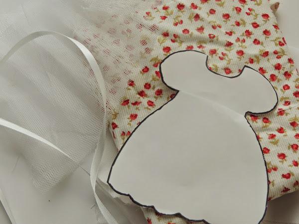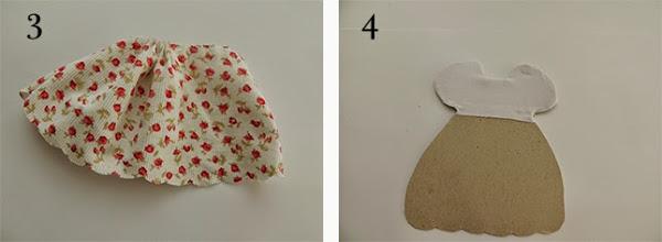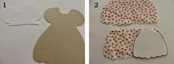 1- Recortamos el molde en el cartón, y en la tela lisa, recortamos solamente la mitad de arriba del vestido.