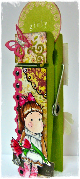 Pues en mi afán por alterar cosas, hoy le ha llegado el turno a una pinzota grande que había comprado, en madera sin tratar, así que despues de capita de pintura...llegó el turno de la imaginación...El sello central Magnolia TILDA WITH TULIPS (gracias Ana!),coloreada con mis rotus (alias los baratos). La mariposa es mi nuevo troquel para la big, Butterflies de C.C Designs, y el troquel de bordes, ...