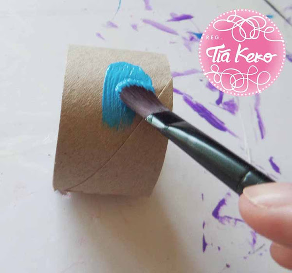 Y una vez tenemos los servilleteros cortados los pintamos del color del que van a ser los pompones. Nosotros hemos elegido dos colores, azul y morado, uno para él y otro para ella,