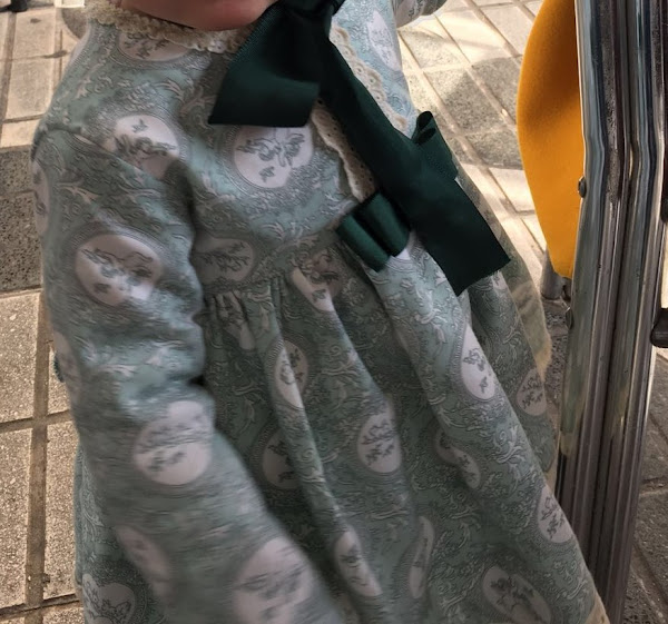 Decidí combinar el verde menta, con el beige y el verde botella. En esta foto estaba cosiendo el lacito, que forma parte de la decoración central del vestido. Para mi un vestido sin lazo...jajaja