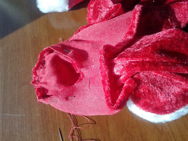 El gorrito cortamos dos piezas en rojo y acoplamos el adorno blanco de peluche igual que para la manga y falda. Yo lo he realizado en tejido de camiseta porque le he planchado un adorno bordado y en la antelina no pega, ya que no se plancha.