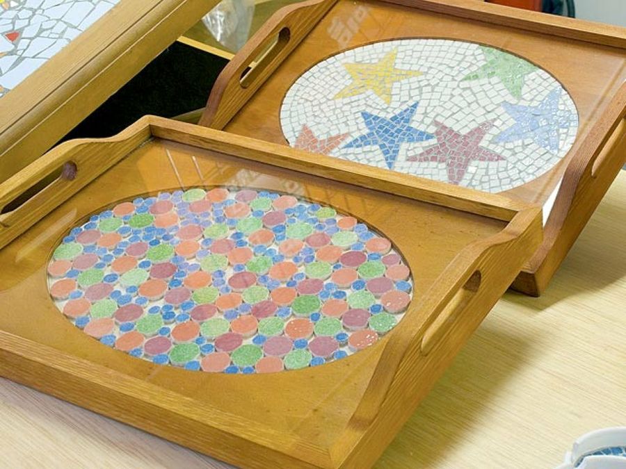 La combinación de madera y cerámica es muy grata, como evidencian los adornos ovales de estas bandejas, uno de ellos con originales “fichas” redondas. Estas piezas se han fabricado también con gresite, recortando cada baldosilla con unos alicates.