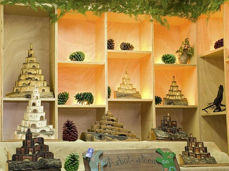 El sector de la madera fue uno de los más exitosos de la mostra. En el stand de Árbol-aldea conocimos sus originales diseños de casitas desmontables, talladas en troncos. Dichas figuras son telescópicas, y se pliegan quedando a ras de la corteza.