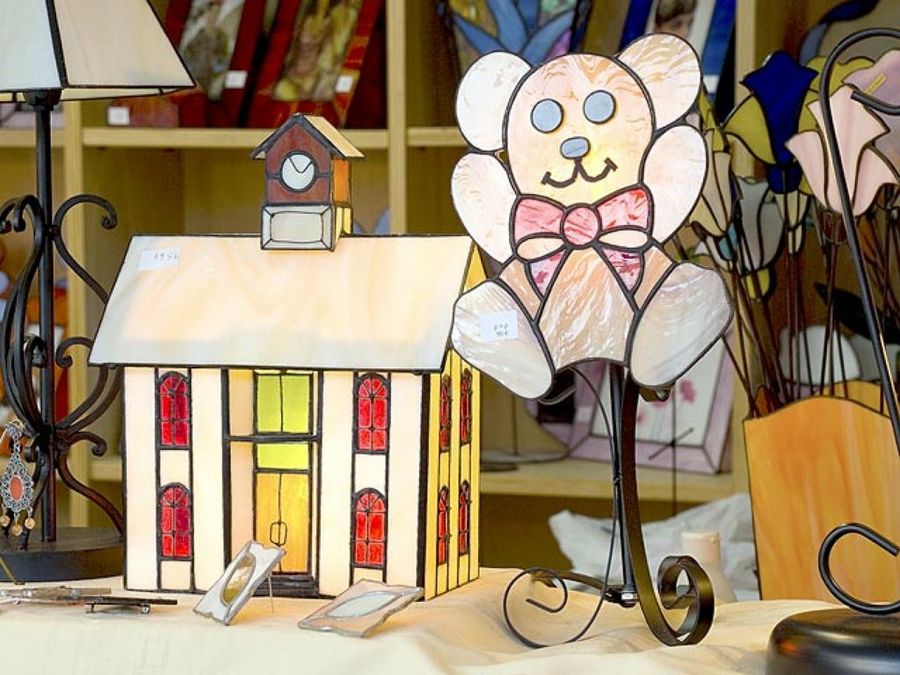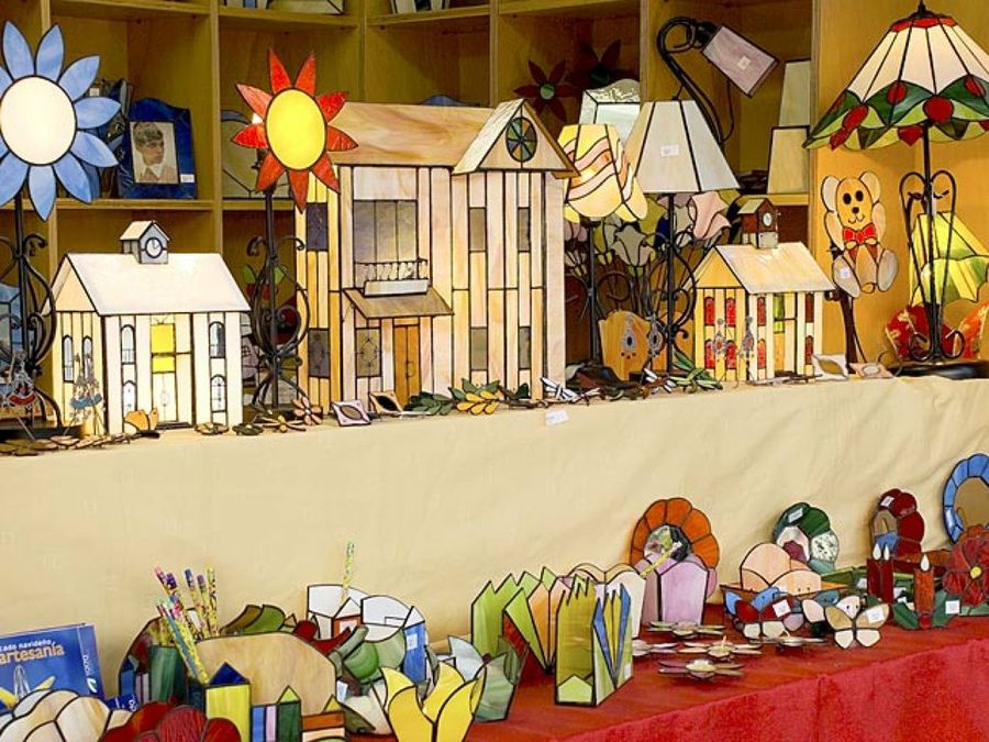 Iniciamos nuestra visita en el stand de la Artesanía Crisluz, especializada en los adornos con cristales Tiffany’s. Entre el cautivador muestrario, llamaban la atención unas preciosas casitas traslúcidas, con iluminación interior. Por supuesto no faltaban las emblemáticas lámparas.