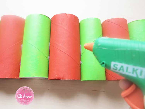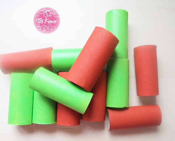 Vamos a utilizar 12 rollos de papel higiénico vacios, de los cuales seis vamos a pintarlos de verde y los otros seis los pintaremos de rojo.