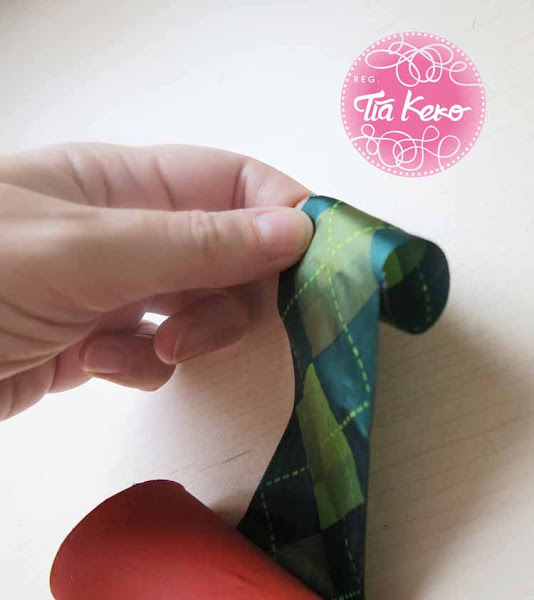 Para poder colgar nuestro calendario de adviento vamos a coger el extremo superior de la cinta y con la pistola de silicona caliente vamos a hacer un arete de cinta en el que después colocaremos un anillo para poder colgarlo de la pared.