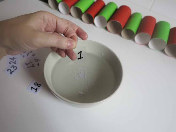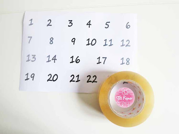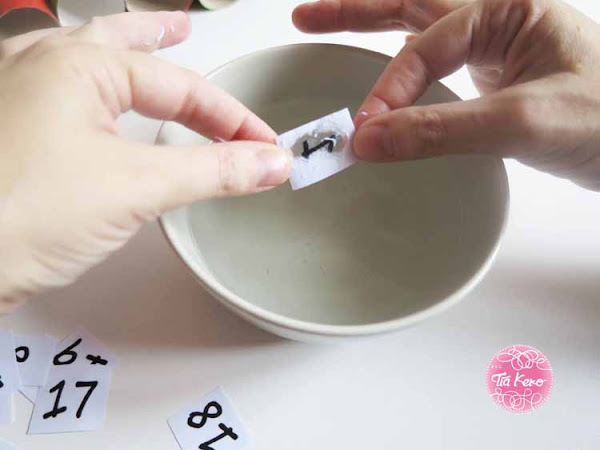 Vamos a coger cada número y lo vamos a sumergir en un bol de agua y con mucho cuidado vamos a ir quitando el papel de la cinta de embalar y veréis como se va quedando el número solo pegado al celo. Cuando el celo se seca podemos pegarlo en el calendario y queda el número solo y más bonito.