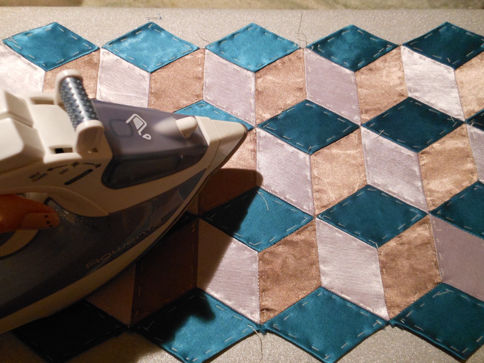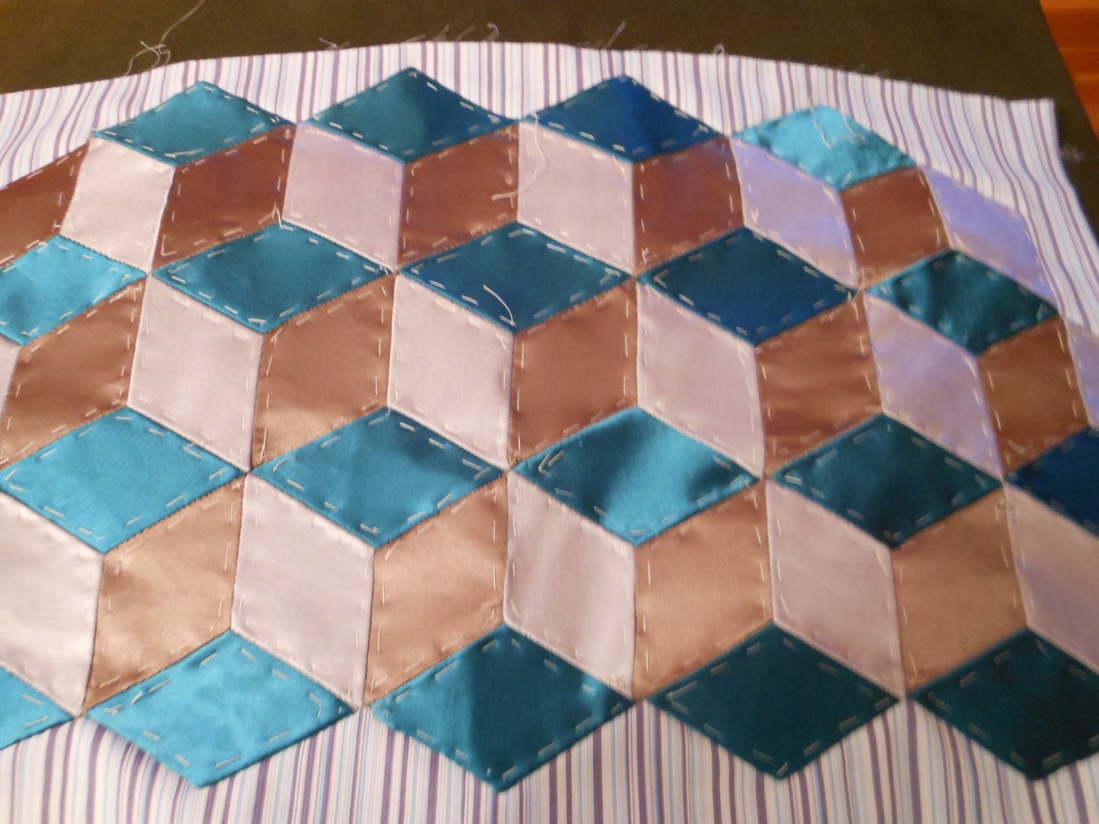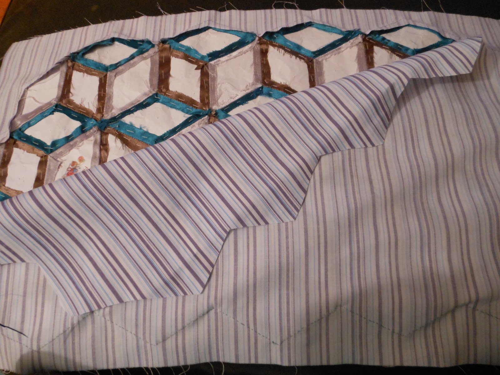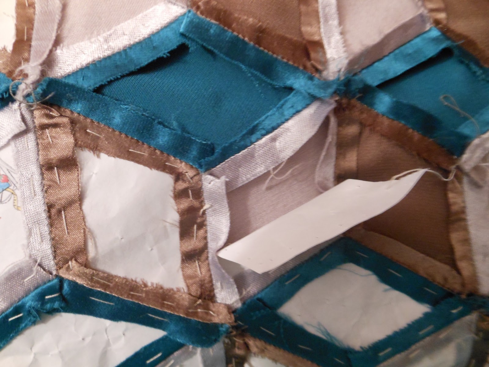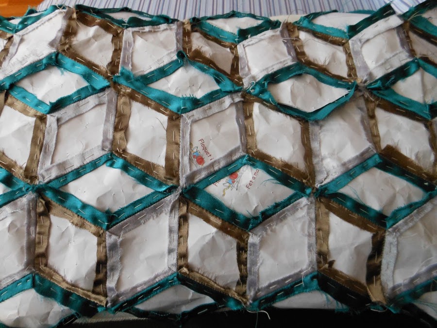 Haremos un rombo de unos 5 cms, de lado, en una lámina de plástico, que nos servirá de plantilla, para ir haciendo sobre papel tantos rombos como vayamos a necesitar, elegiremos 3 telas diferentes, para que hagan el contraste (mejor utilizar telas de algodón) son más fáciles de dominar.Iremos cortando tiras y después sujetamos con un alfiler los papeles dejando alrededor 1/2 cms. para hacer la orilla, hilvanar, como en la foto,