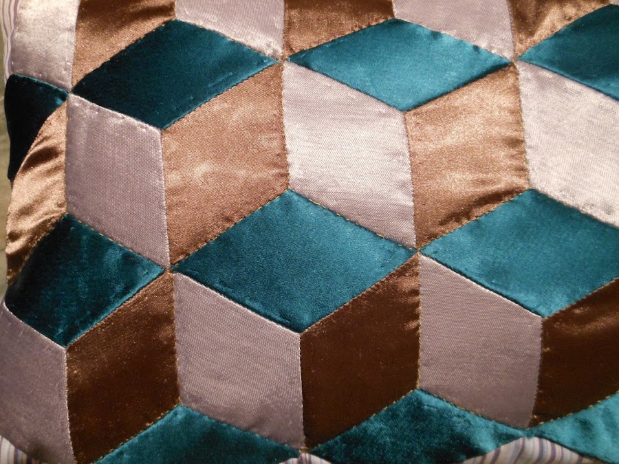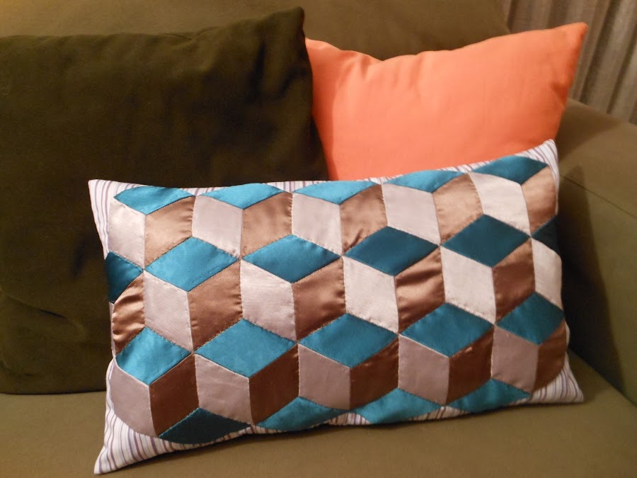 Estoy tranquilamente en casita, terminando este cojin, para la camilla terapeutica de mi hija.A ella le encantan estas telas brillantes de raso o satén, bueno siempre lio