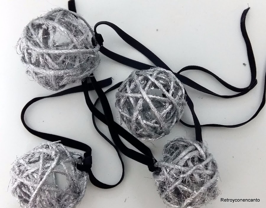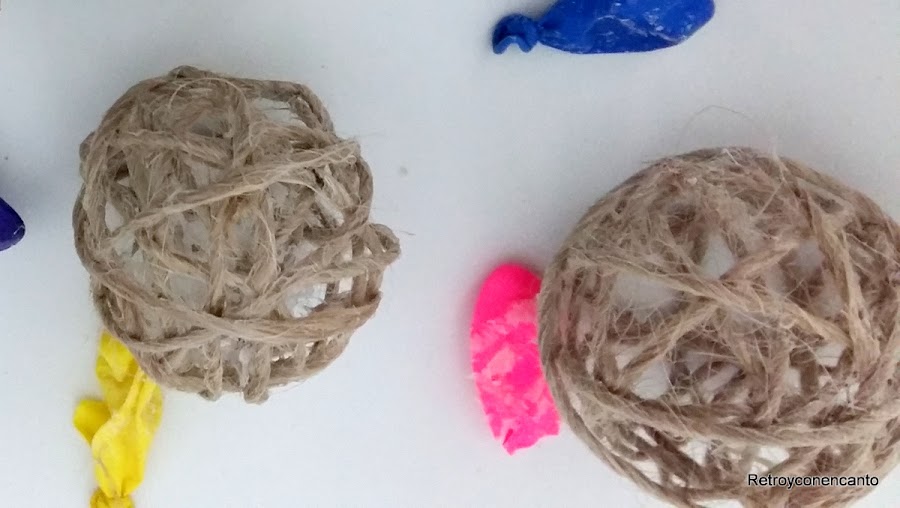 Cuando la cuerda ha adquirido la consistencia suficiente, pinchamos los globos y los sacamos con cuidado del interior.