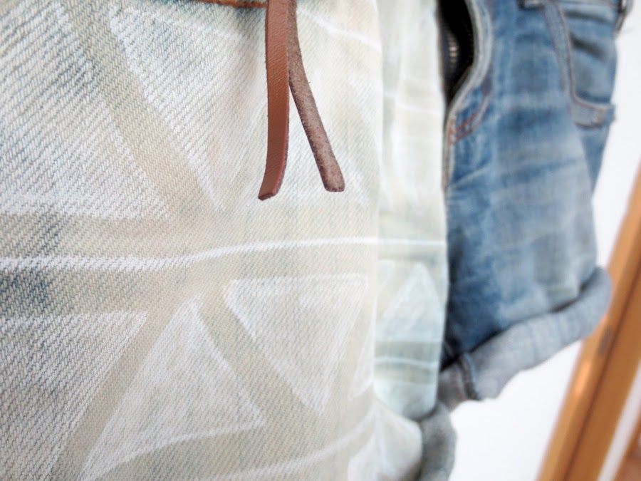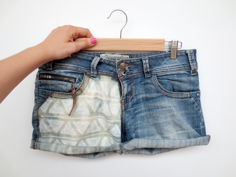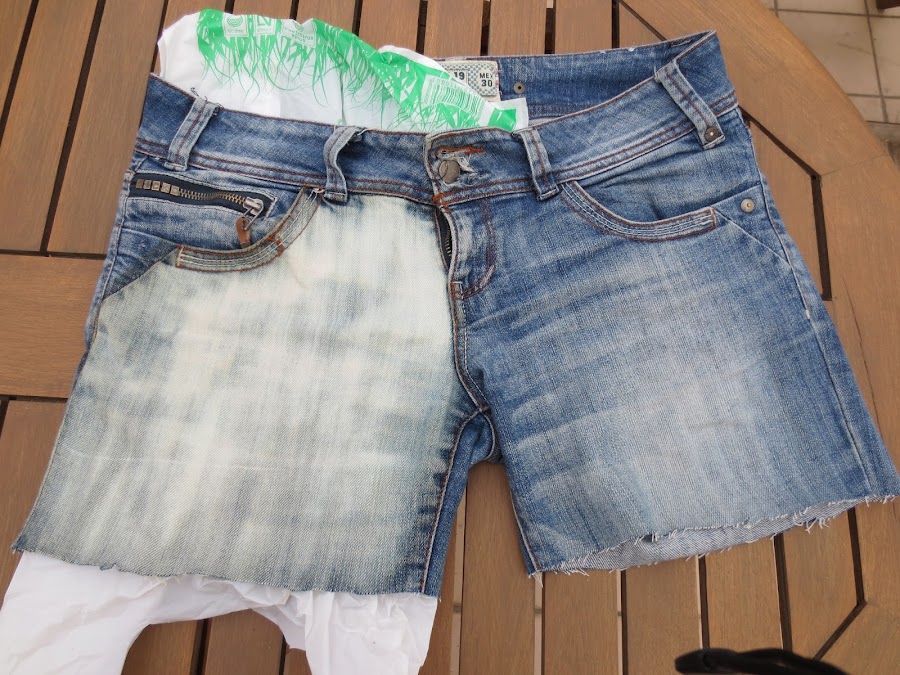 Lo primero que necesitaremos es mezclar lejía con un poco de agua, coger una esponja y mojar la mitad del short que prefieras. Yo he dejado la parte del bolsillo original para conseguir un mayor contraste. Recuerda colocar una bolsa de plástico dentro del short para que la lejía no traspase o acabarás con un trasero un tanto descolorido! Luego, simplemente deja a la química actuar hasta que el pantalón esté seco. Si quieres aclararlo más puedes repetir este paso cuantas veces desees.
