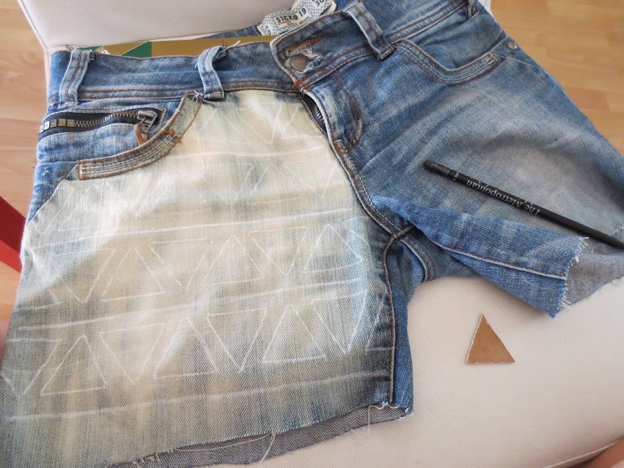 Después de decolorar el pantalón vamos a dibujarle un motivo étnico para darle un poco más de interés. Con un cartón cortado en forma de triángulo y un boli de pintura blanca para textil ves dibujando la silueta del triángulo primero hacia arriba y después hacia abajo como puedes ver en las imágenes siguientes: