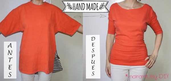 Aquí os muestro un paso a paso en fotos de mi aportación, he transformado la típica camiseta de algodón talla XL de tu marido, padre, hermano o similar y la he convertido en una camiseta de chica de lo más estilosa. Ajustando cintura y mangas y abriendo el cuello, voilá!!!
