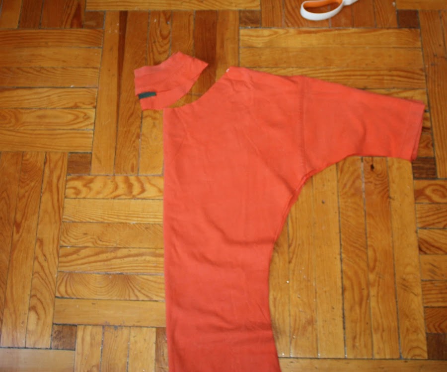 5. Para cortar el cuello, doblamos la camiseta justo a la mitad como en la foto.