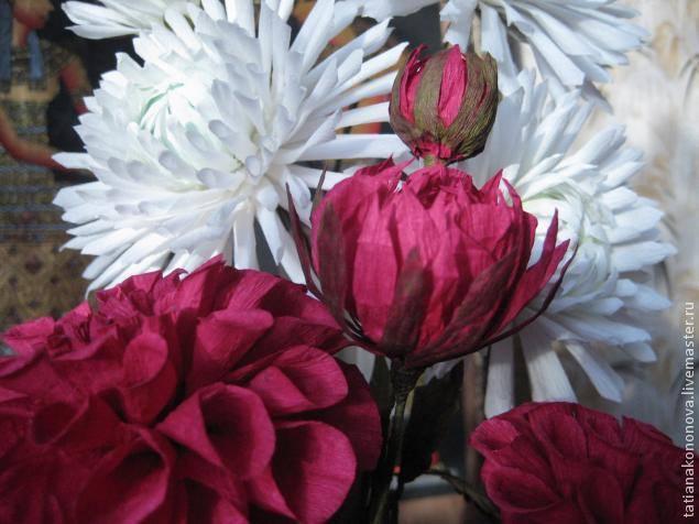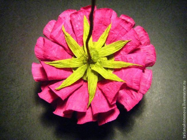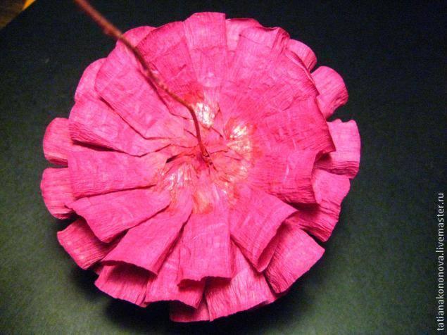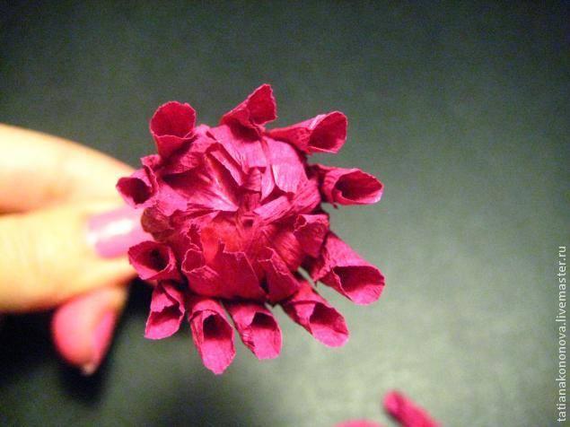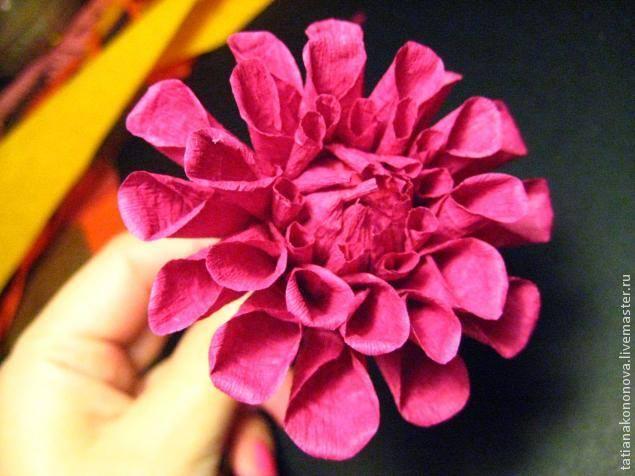 El centro de las dalias de papel crepé se hace con una bolita de papel arrugada forrada con papel crepé y pegada a un alambre (alambre se pega por dentro de la bolita). Luego cubrimos la preparación con una tira de papel crepé que parecerá a los pétalos internos. Imitar la imagen.