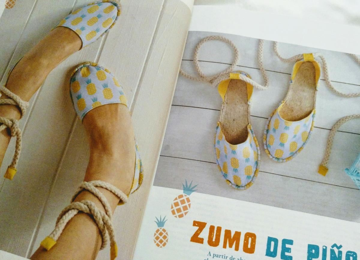 Las alpargatas que nos propone Suzie Kemner. www.suzielondonuk.com, los cojines tropicales de Laura Strutt www.madepeachy.com y el precioso puf extraído del libro “Cushions, curtains and blinds. Step by step”
