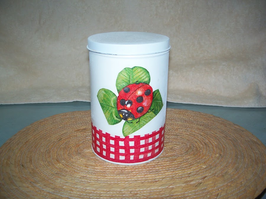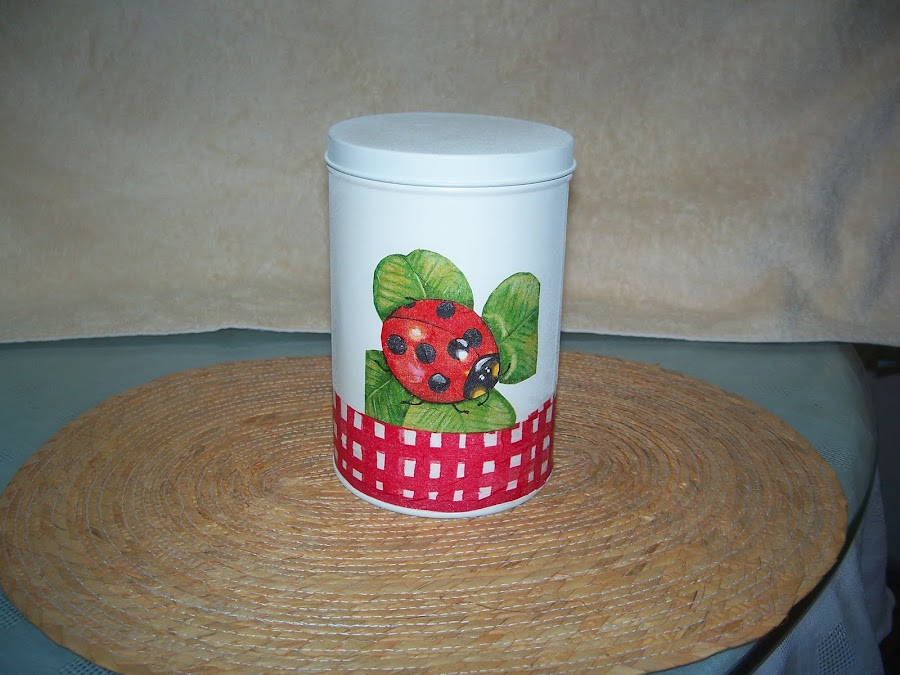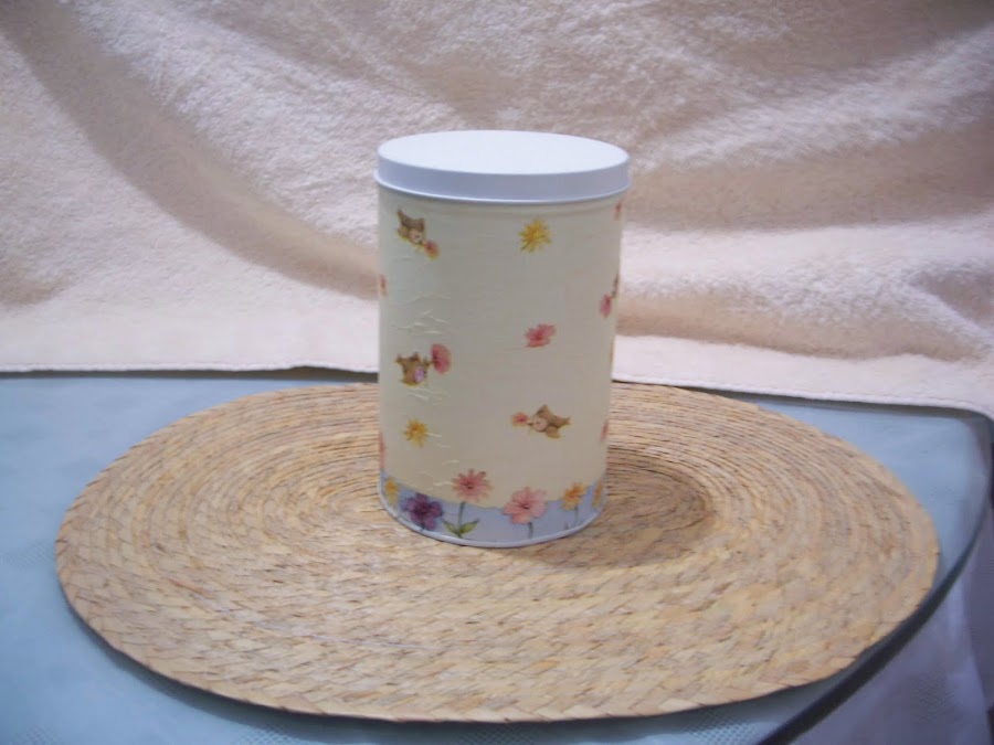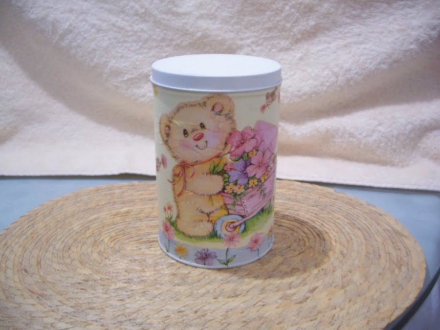 O la manera de recuperar y darles uso a recipientes que fueron unos ...y ahora son otros distintos. El primero uns caja metálica grande y en su forma bonita, pero horrorosa en decoración, con publicidad y un color verde botella feisimo. Y con el buen ánimo de estos días, una visión alegre y ganas... una nueva vida con unas divertidas y dulces servilletas con mensaje: &quo ...