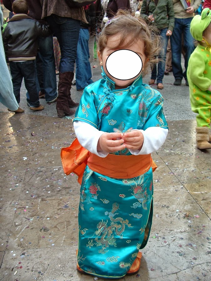 (El disfraz de china y el disfraz de rumbera son comprados hechos y adaptados por mi, y el de virgen fue al año siguiente adaptado a angelito, jejejeje, hay que reciclar)