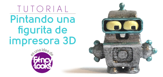 tiene una impresora 3D y está haciendo sus primeros pinitos imprimiendo. Ofrecía a la venta unas pequeñas figuritas de robots muy baratas, supongo que serían parte de sus pruebas con la impresora. No eran perfectas pero estaban chulas y, aunque muy pequeñitas, me apeteció mucho pillarlas para retocarlas y pintarlas. Las dos figuras representaban al mismo personaje, Bender Jr. , de la serie Futurama.