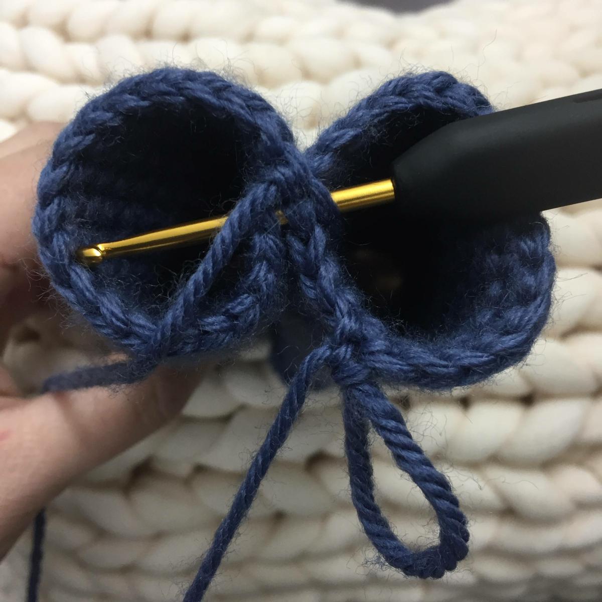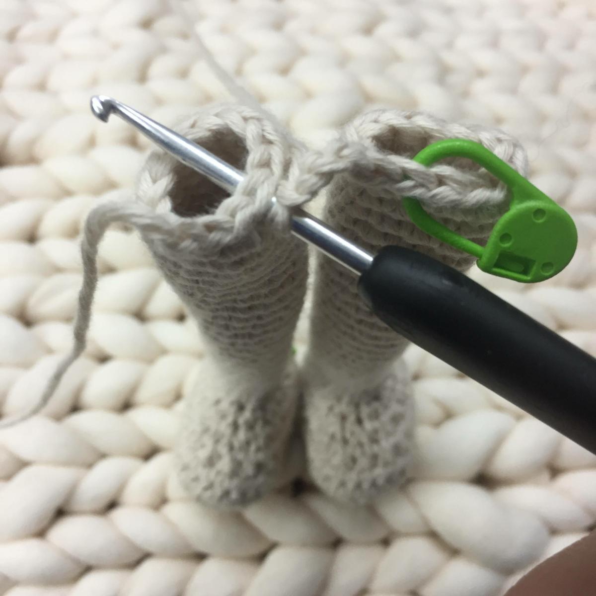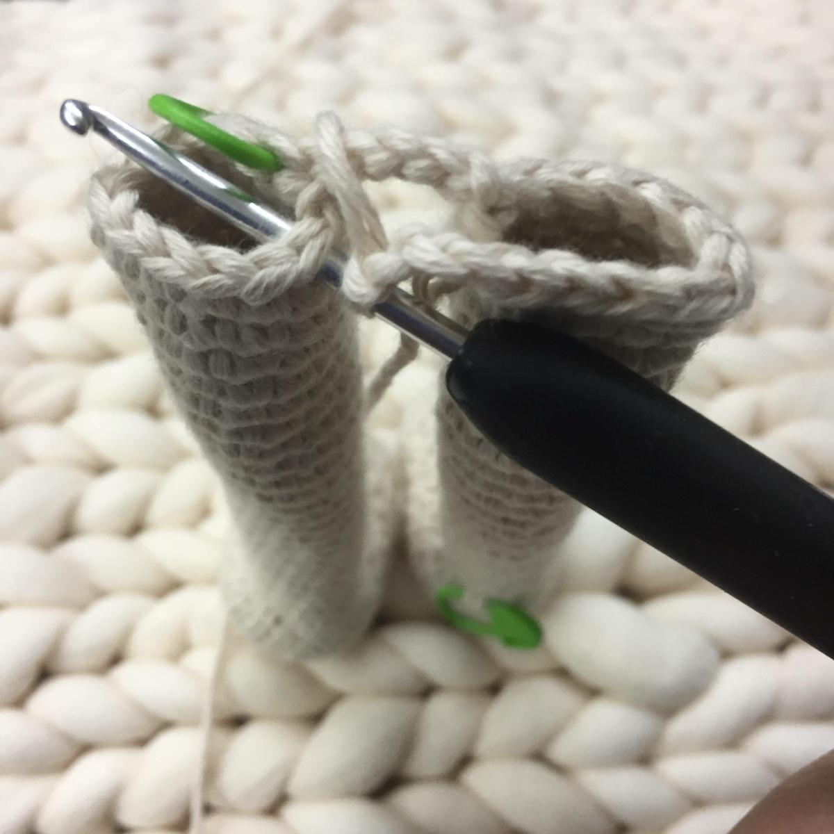 Unir estas dos partes tejiendo un punto bajo en el siguiente punto del dedo con uno de la mano, este punto quedará de unión y ya no se contará en las vueltas siguientes