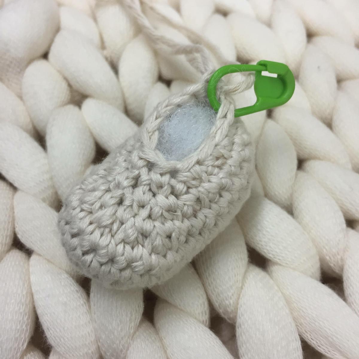 1ª vta.- Hacer 9 cadenetas y pinchando en la segunda cadeneta contando desde el gancho hacer 7 puntos bajos en las 7 cadenetas siguientes, en la última cadeneta hacer 3 puntos bajos, ahora trabajar en el otro lado de las cadenetas donde están tejidos los anteriores puntos bajos (si tenéis dudas, mirar el vídeo de como hacer las zapatillas del muñeco Danilo) 6 puntos bajos en las siguientes 6 cadenetas, 2 puntos bajos en la ultima cadeneta (18 puntos)