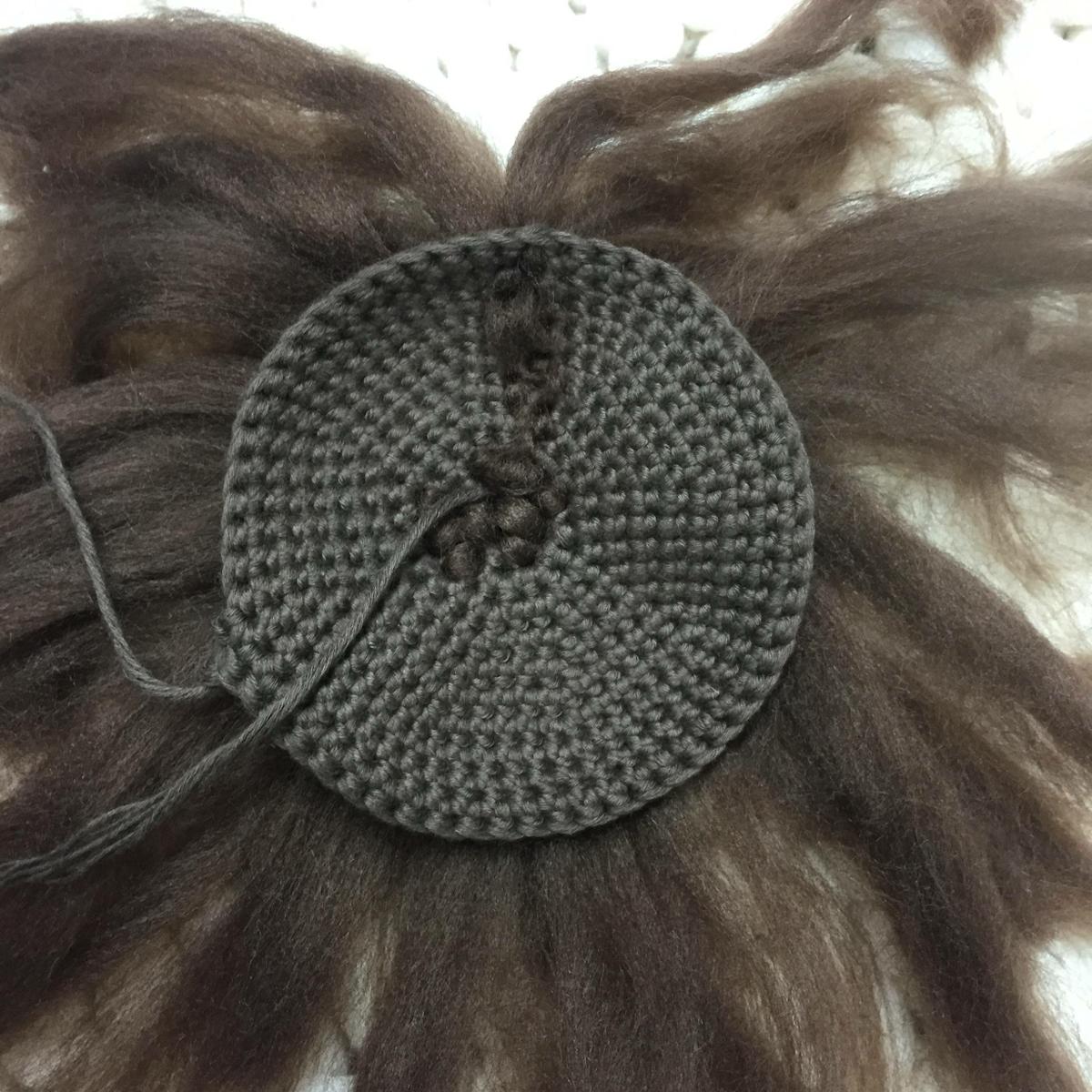 Para colocar el pelo, cortar unos mechones de 10 cm e ir colocándolos primero en la primera vuelta, metiendo las puntas del mechón por dos agujeros diferentes y tirar, luego marcar una recta imaginaria y sacar mechones por esos puntos para hacer el efecto de la raya.