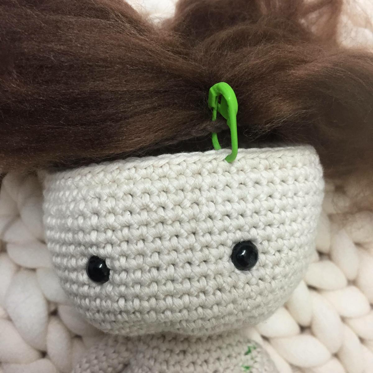 Antes de coser el cráneo, tener en cuenta la colocación de la raya del pelo. Como mi muñeco de ganchillo lleva la raya al lado, con ayuda de un marcador sujeto el punto del cráneo con el de la cabeza donde quiero que vaya la línea del pelo.
