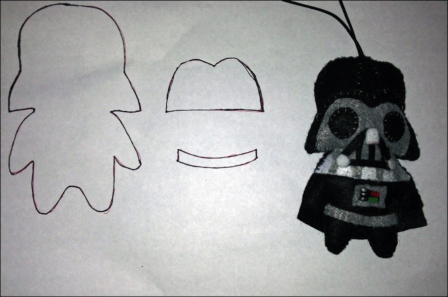 El muñequito original lo vi en el suplemento de un periódico. Es facilísimo de hacer. Lleva dos piezas negras (os pongo el dibujo que hice, por si os interesa), y un montón de piezas pequeñas en fieltros blanco, negro y gris. Las piezas grandes están cosidas con punto festón en color gris, para remarcar, y está cerrado (las dos siluetas negras) con punto festón negro. Las piezas mas pequeñas (como el detalle de la parte delantera en color gris, blanco y rojo) están pegadas con silicona líquida.Lo he rellenado con algodón artificial y le he puesto la capa tras terminarlo.