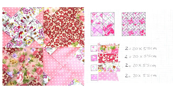 Get to work. The materials we use are: 8 strips of 20cmX55 cm, in 4 different tissues, i.e., two strips of each. We matched them how you see in the drawing. How we always leave an annex with the sizes and quantities.