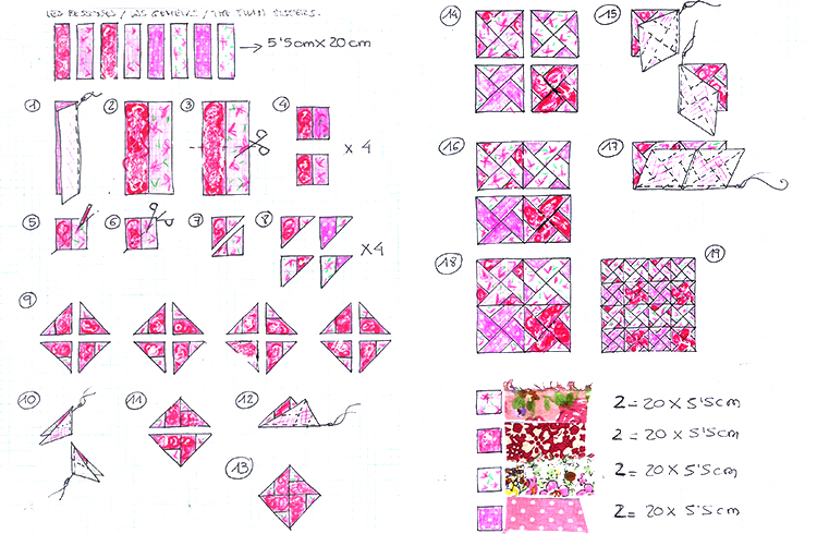 Now we sew the mini blocks according to the usual routine: we sew the two triangles above and the two below (10) and get 2 large triangles (11) that we sew by the centre (12). We have already finished the mini block (13); we repeat it with the rest and have the parts to make our variation (14). The last phase is the join the mini blocks: as always, we sew the two above and the two below between them (15) obtained two strips (16) and joined them by the centre (17). Finally, we have finished the block (18).