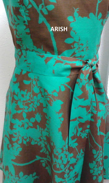 El vestido esta hecho en batista transparente de algodón, en fondo marrón con estampación en verde.
