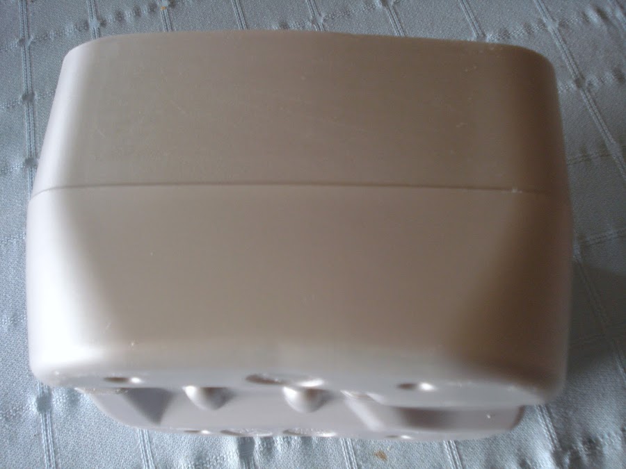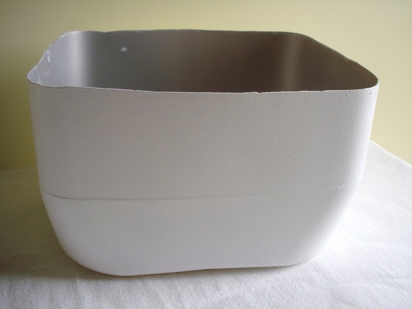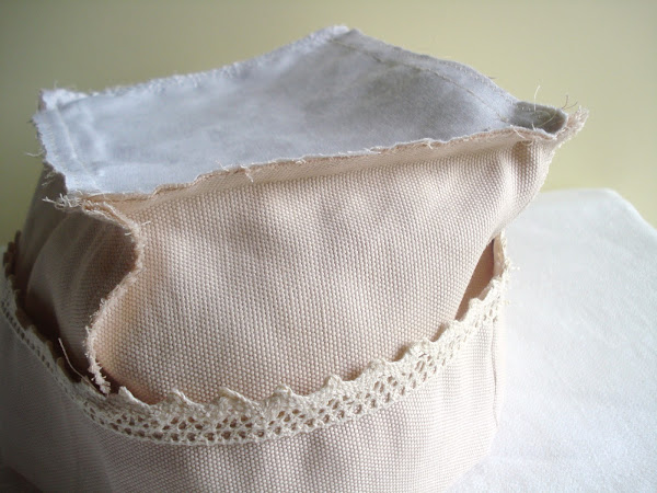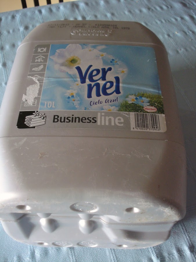Bote grande de suavizante, tela y entretela, puntilla, imprimación, pintura acrílica blanca y barniz.
