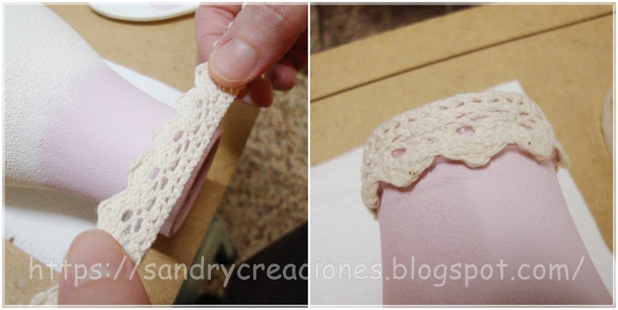 Paso 7. Colocar cinta decorativa como embellecedor. Colocamos una cinta decorativa alrededor de la boca de la botella y la pegamos con silicona caliente para darle un mejor acabado a esa zona.