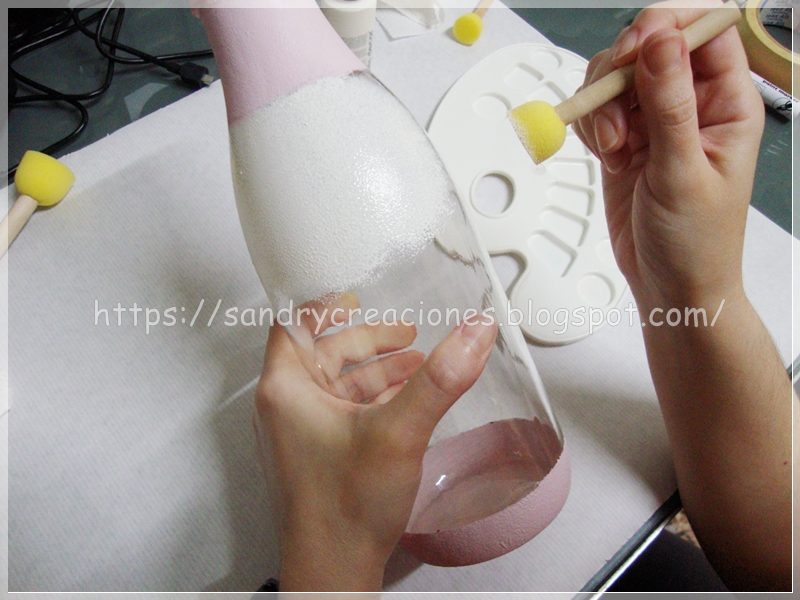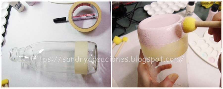 Paso 2. Pintamos el cuello y la base de la botella con pintura a la tiza de color rosa. Para limitar las zonas donde pintaremos con pintura a la tiza de color cuarzo rosa, y no ensuciar de rosa la zona donde queremos pintar de color marfil, pondremos cinta de carrocero en la parte de debajo de la botella dónde nos interesa que quede una delimitación recta y marcaremos ligeramente con un rotulador permanente la parte del cuello de la botella porque aquí lo que haremos es una delimitación difusa. Seguidamente con un pincel de espuma iremos cubriendo las dos zonas con pintura a la tiza de color cuarzo rosa.