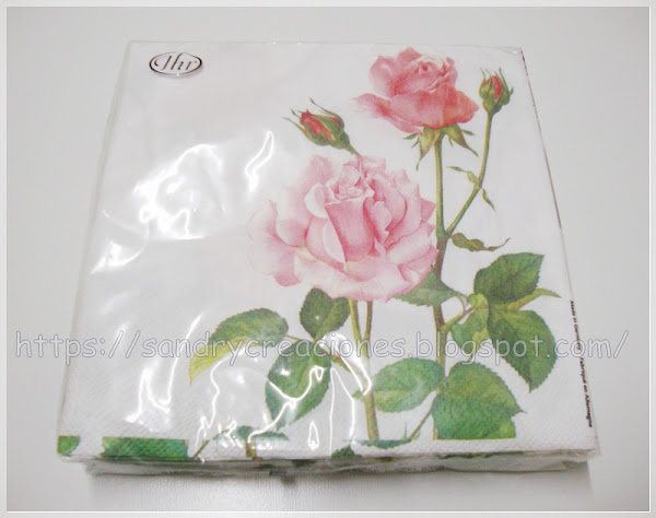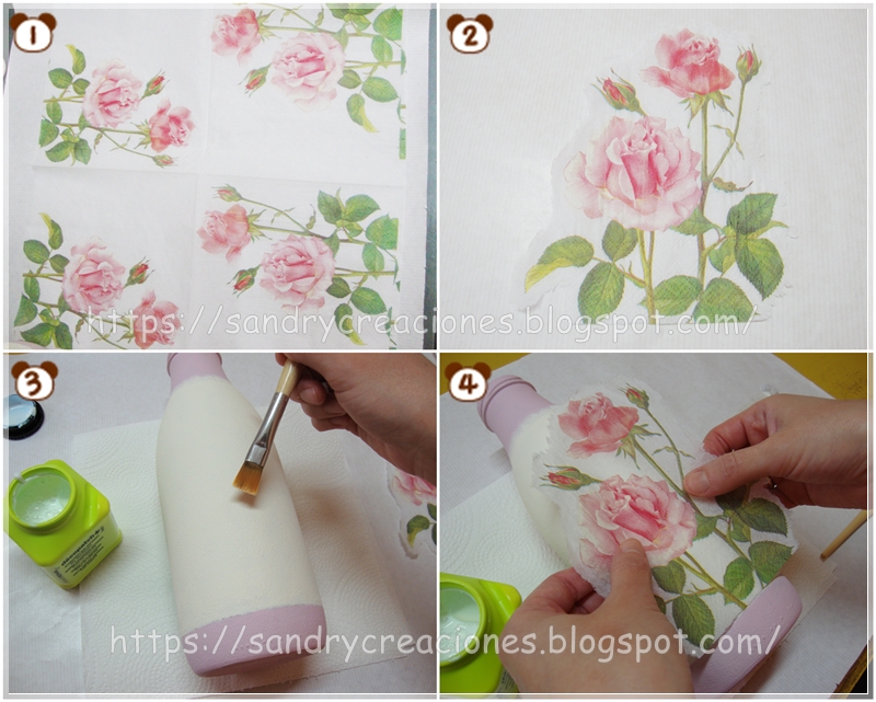 Paso 4. Realizaremos el decoupage en la zona de color marfil de la botella. El primer paso será recortar el motivo que queramos de las servilletas elegidas. Nosotros queríamos un motivo floral así que cuando vimos unas servilletas con rosas no nos lo pensamos y las adquirimos para este trabajo. Para cortar el motivo usaremos un truco realizado por nuestra amiga Amparo del blog "El Rincón de las Manualidades Caseras" que no es otro que mojar con un pincel humedecido en agua el contorno por donde queremos recortar y con cuidado vamos rompiendo la servilleta por esa zona húmeda con las manos, de esa forma podremos cortar el motivo sin peligro que se rompa por donde no queremos. Desplegamos la servilleta (foto 1), quitamos las capas que tiene y nos quedamos solo con la superior, recortamos el motivo y una vez recortado (foto 2) pasamos a realizar el decoupage con el motivo.