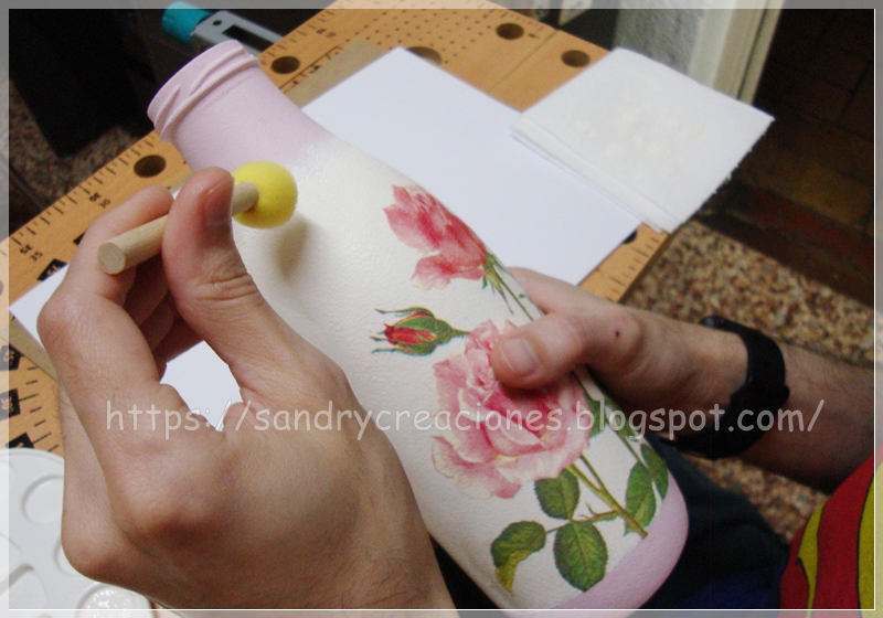 Paso 6. Barnizar nuestro florero. Ya con el decoupage terminado y la botella terminada de pintar podemos proceder a barnizar nuestro florero con barniz mate.