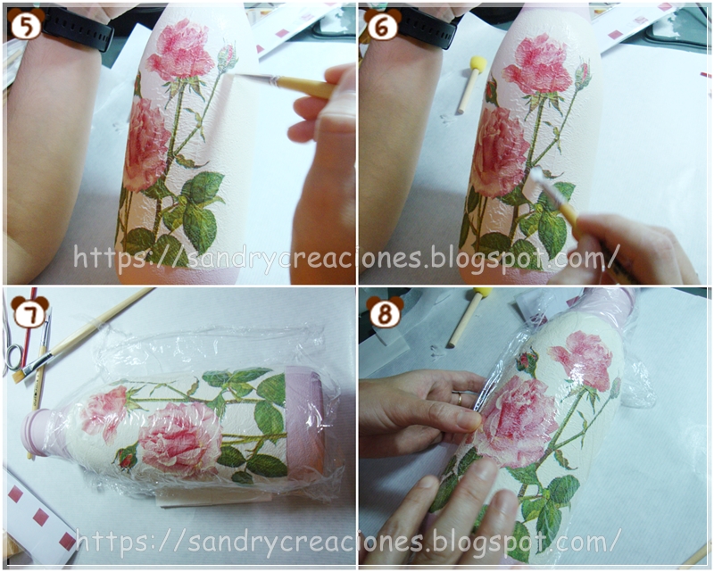 Seguidamente vamos pasando, con ayuda de un pincel, la cola de decoupage por encima del motivo (imágenes 5 y 6) hasta que quede todo cubierto. De forma opcional nos podemos ayudar de un trozo de film plástico para ayudarnos a quitar las arrugas que nos hayan podido quedar en el motivo (imágenes 7 y 8).