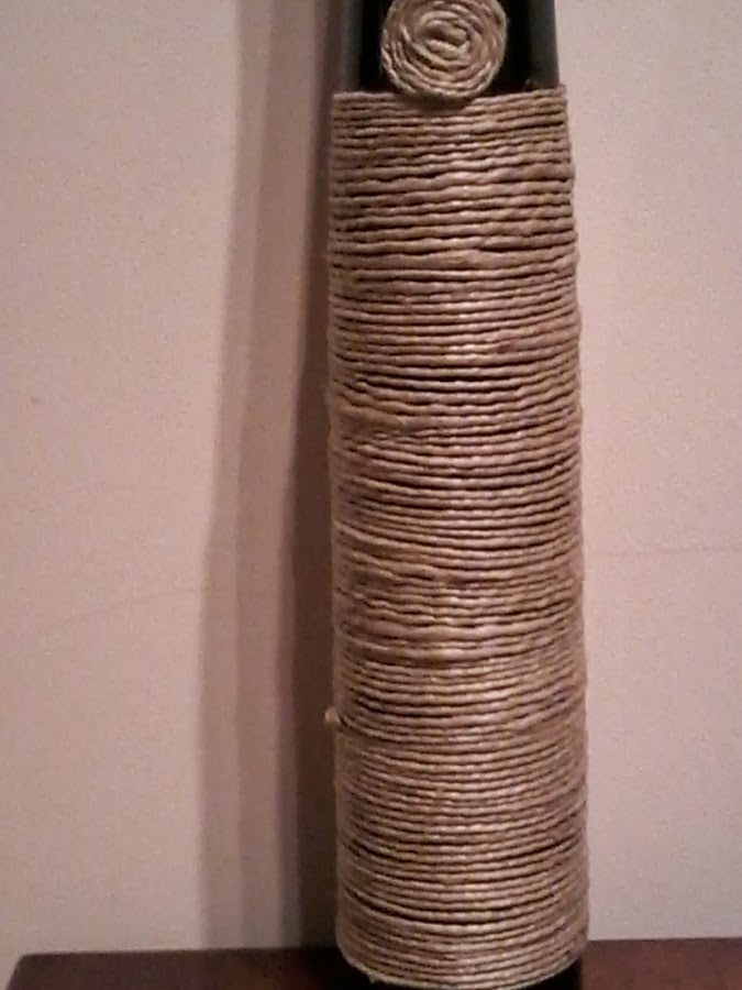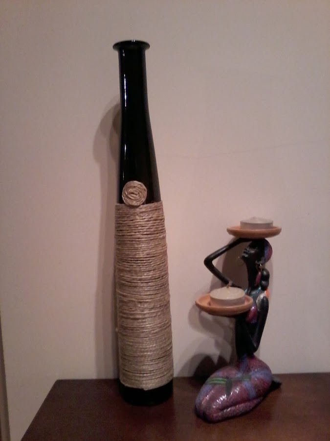Y esta botella de vino tan estilizada no podía terminar en el contenedor verde si, simplemente con un ovillo de cuerda y cola blanca le podía ofrecer una segunda vida y un puesto de honor en la casa.