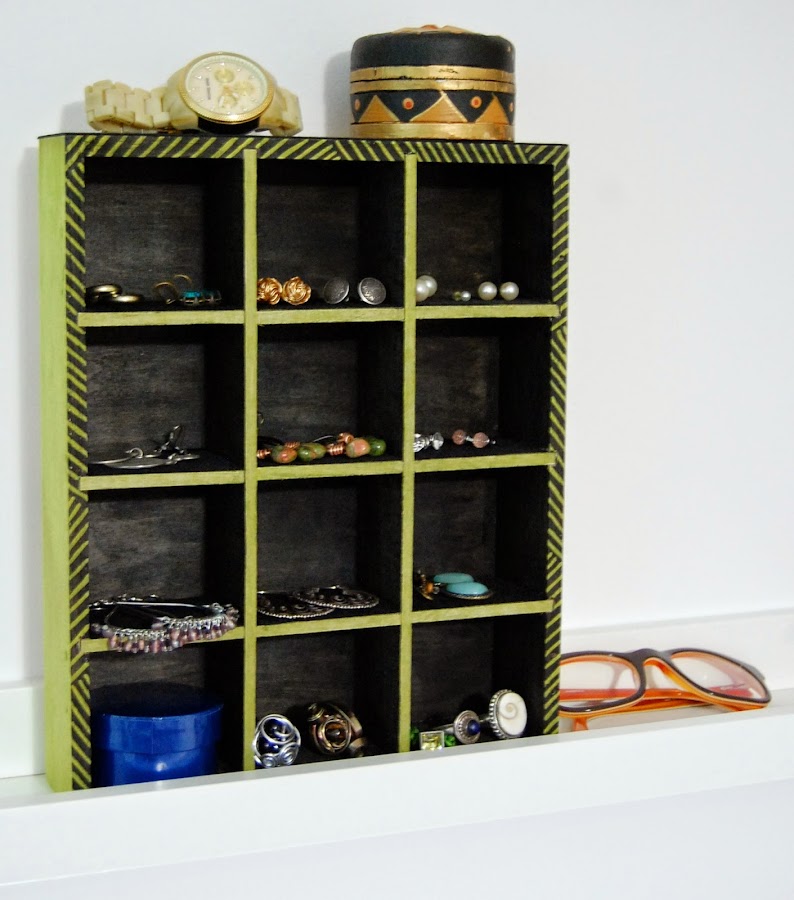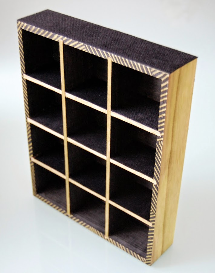 3- Con el terciopelo adhesivo cortamos cuadraditos del tamaño de las celdas del joyero para que ahí apoyen los pendientes o sortijas. También he puesto en la parte superior más terciopelo para así aprovechar y poner relojes, o apoyar las gafas.Ya lo tenemos listo! Lo he hecho vertical porque me cabe perfectamente en una estantería estrechita que tengo en mi habitación. También está pensado para poner las cositas que utilizas más a menudo (al menos ese es mi caso).