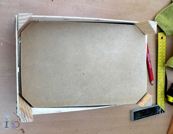 Luego, sobre estos listones pegaremos nuestra pieza de cartón-madera, pero como va a ir decorada es más fácil decorarla antes de pegarla.