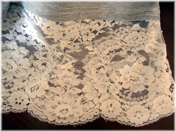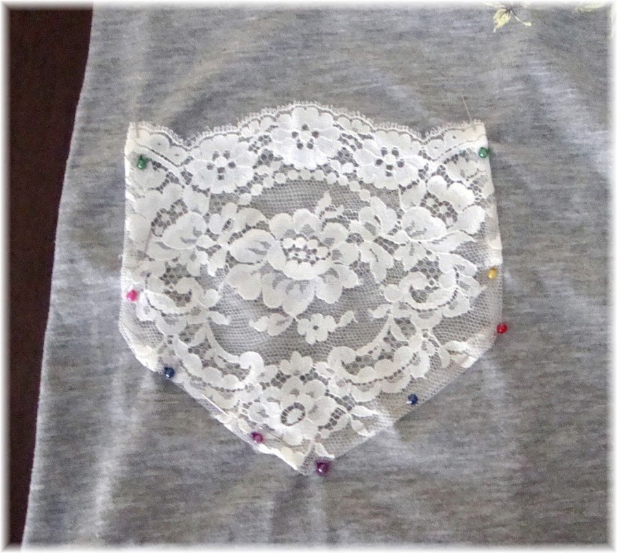 Y con un trocito de encaje, el detalle del bolsillo, con forma en pico respetando los dibujos. De nuevo lo marco con alfiler e hilván y después lo coso a mano.
