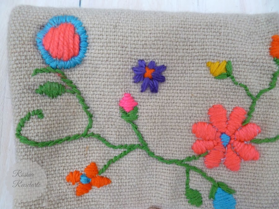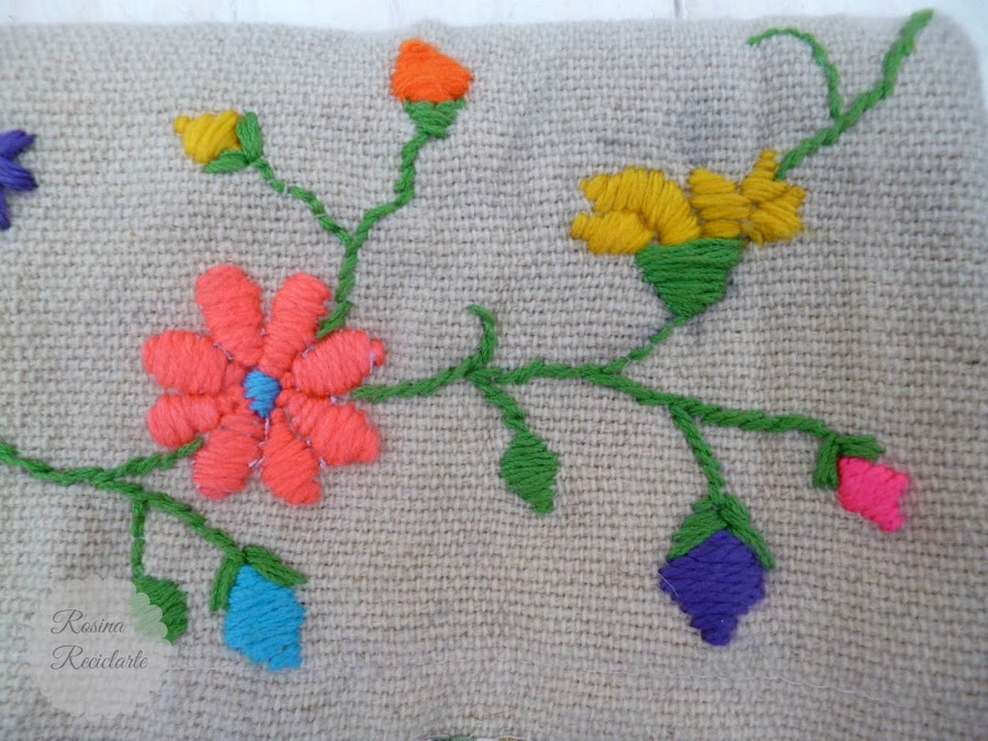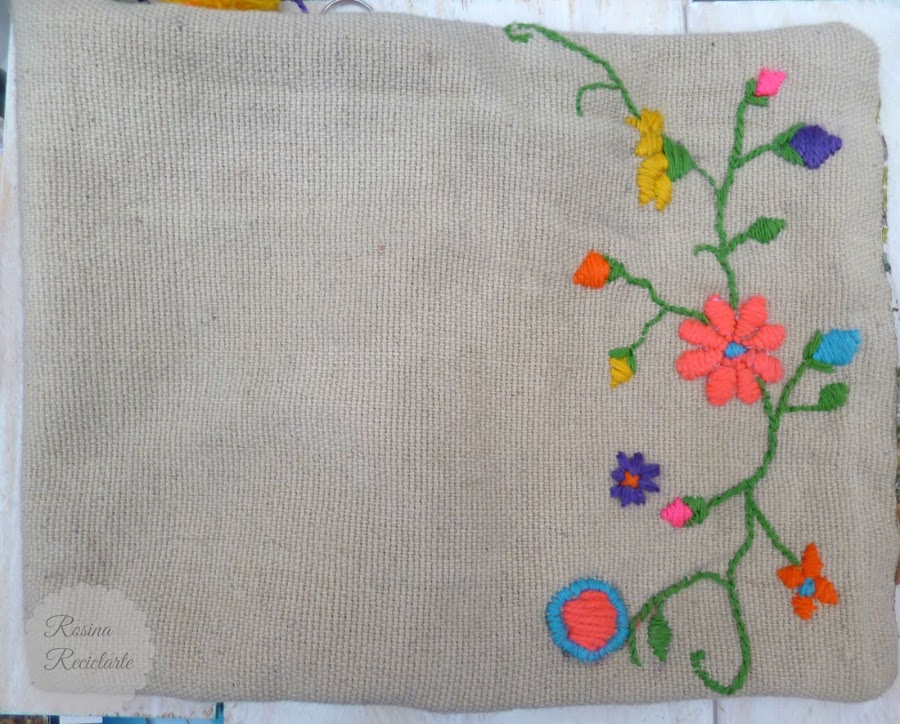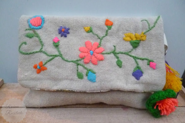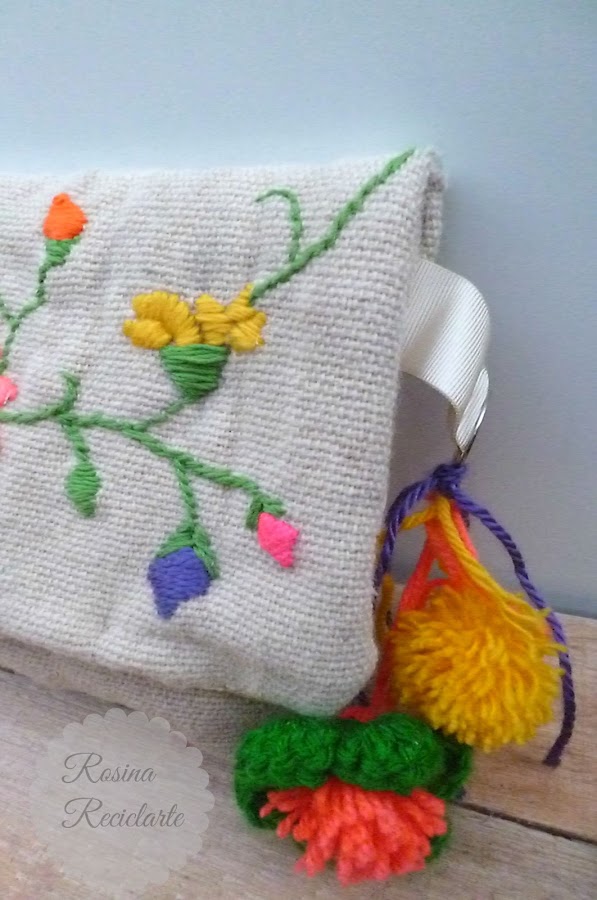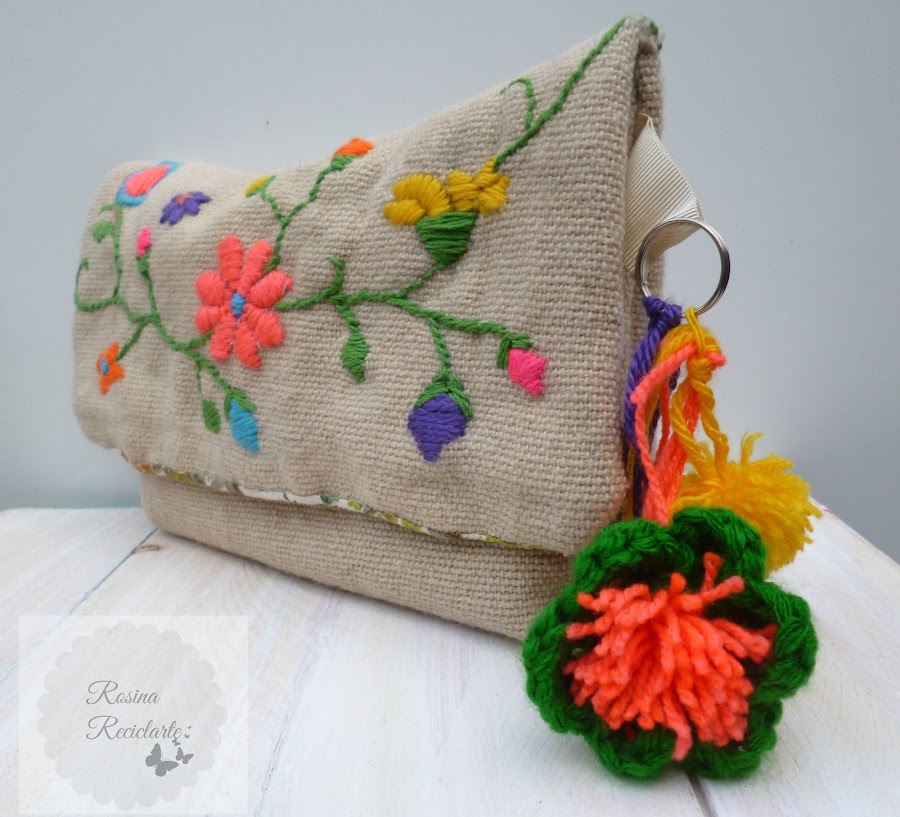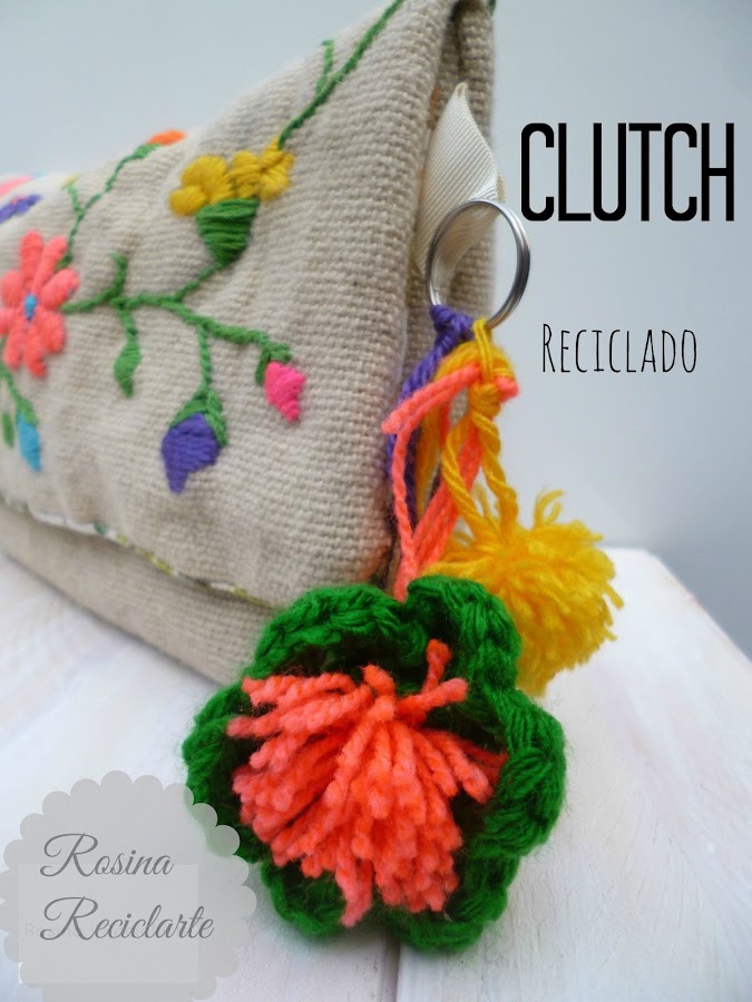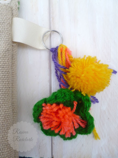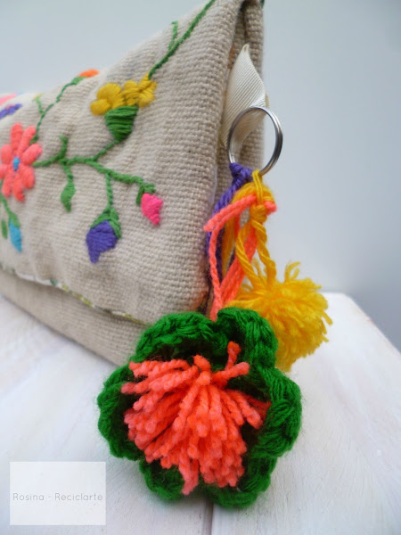 Como corolario, y por si era poco el colorinche del bordado,(más los pompones que capaz algún día le pegue)en el lateral le puse un llavero con pompones y flores.