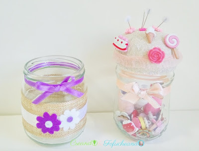 Lo siguiente fueron los frascos. Esos dos botes de cristal reciclados convertidos en porta velas o porta todo y en un alfiletero súper dulzón, jajaja.