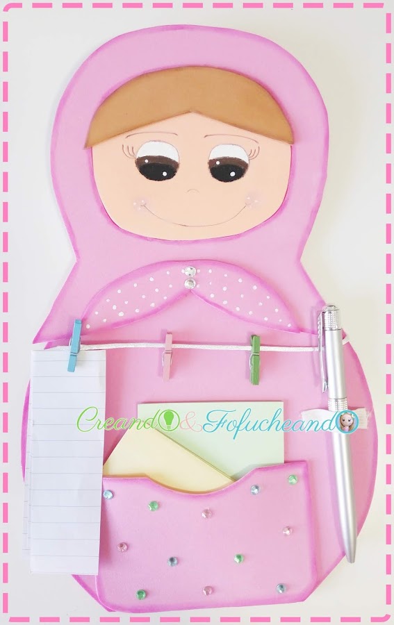 Con un bolsillito y una cuerdecita pa tender las notitas, jajaja, nos podemos hacer un sencillo organizador para Notas y possit, y tunearlo como más nos guste, en mi caso basado en las preciosas muñequitas rusas.