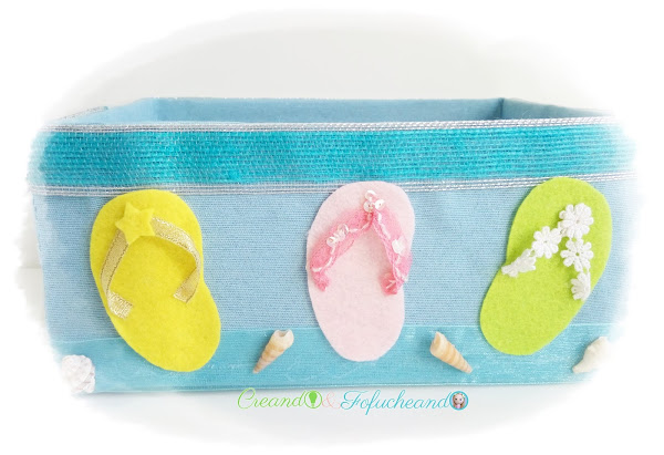 Tenía por ahí una caja de cartón medio abandonaílla así que me busqué una tela apañá, en este caso celeste pa que me recordara al mar, y la tuneé también con un par de cintas y una chanclas de colores alegres en Fieltro que están teniendo su público, jajaja.