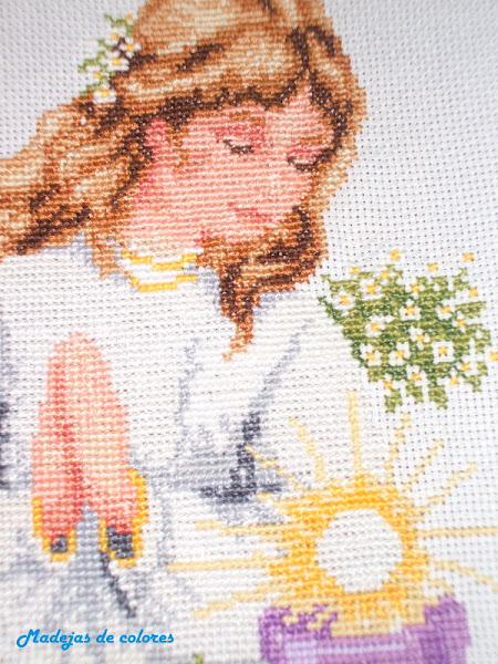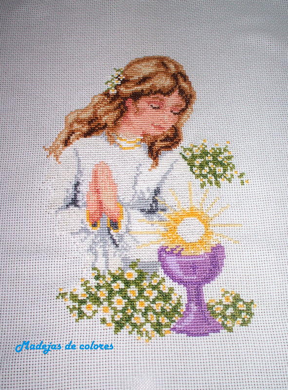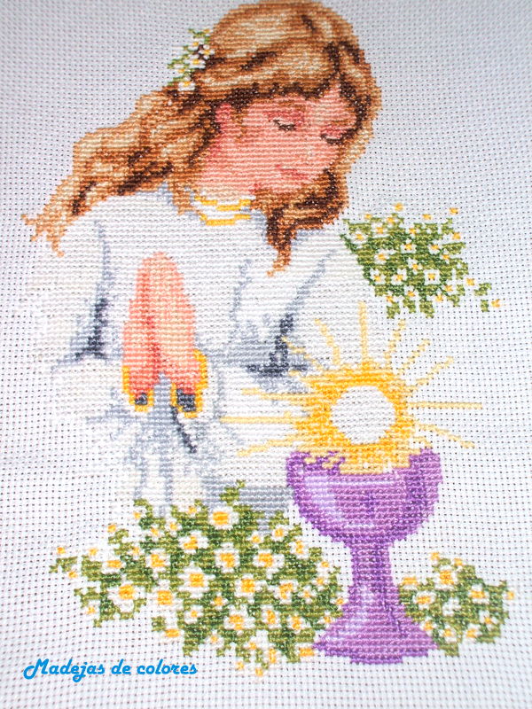 Una amiga tiene que acudir a una en breve y pensó hacerle como regalo a la niña, un cuadro a punto de cruz, para recordar ese día. Como el tiempo se le ha echado encima y está viendo que no va a poder terminarlo a tiempo, me pidió si yo podía terminárselo.