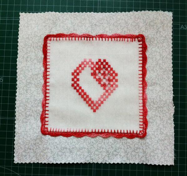 El detalle es para chica que se casa dentro de poco, y entre varias amigas decidimos hacer cada una un bloque para unirlos en un quilt. Lo que viene siendo una colcha de la amistad. Mi bloque, rematado con una puntilla de ganchillo, quedó así.