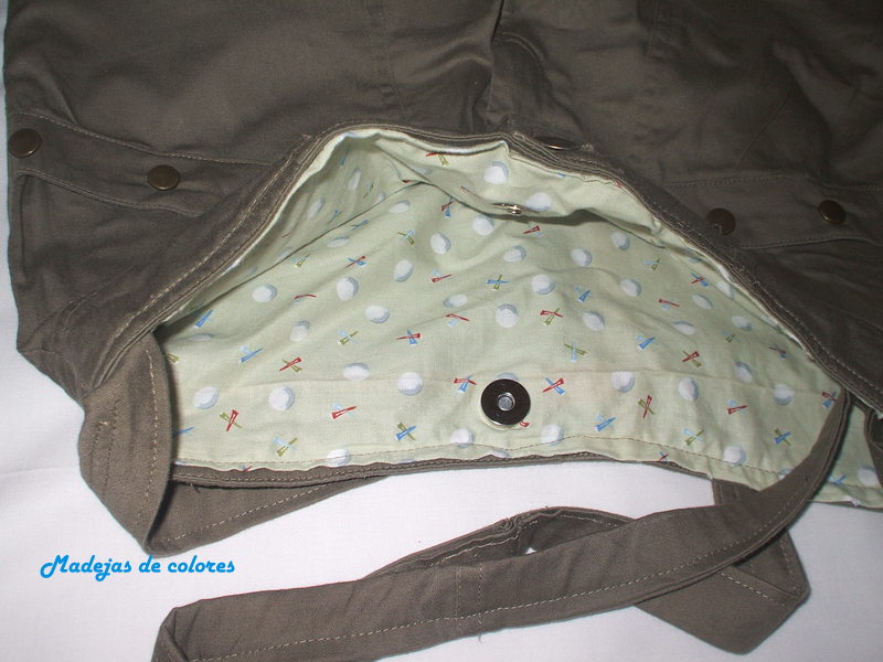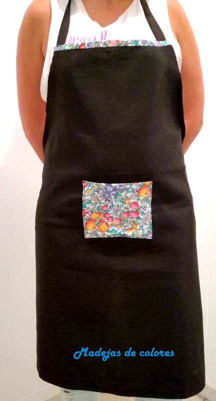 El primero se lo di antes de fecha para que fuera usándolo, Con las prisas sólo le puse un bolsillo con una alegre tela estampada de frutas y un bies en la parte superior con la misma tela.