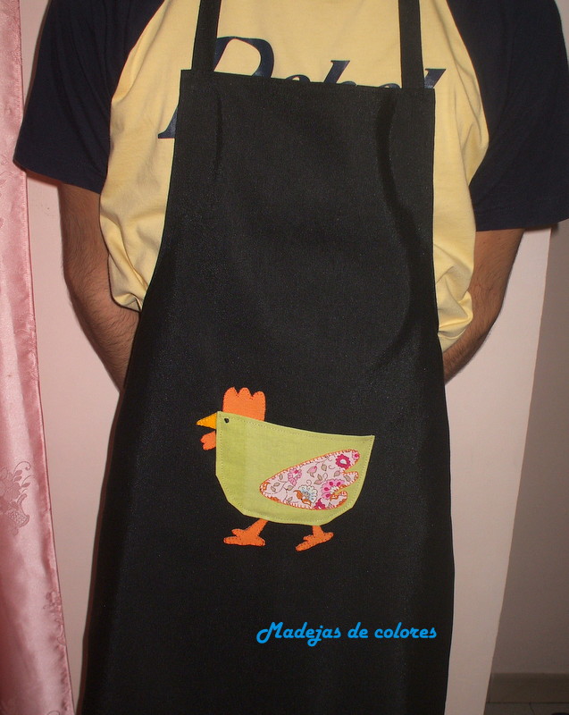 Y a este otro le hice un bolsillo en forma de gallina, con unos tonos ácidos muy alegres, que le dan vida a la seriedad del negro.