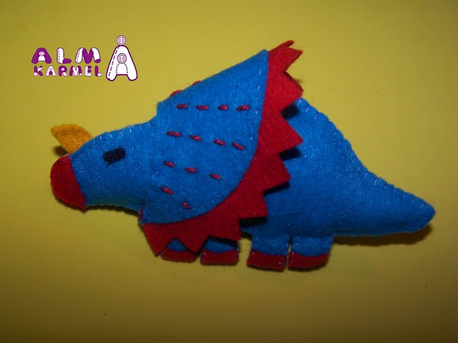 Y aquí el gran Triceraptor, también en fieltro, y en esta ocasión en azul y rojo.